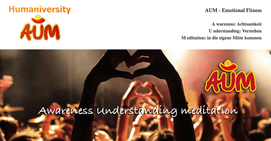 Die AUM (entwickelt von Veeresh D.Yuson-Sanchez) ist eine aktive soziale Meditation, die in 2,5 Std. durch die ganze Bandbreite der Gefühle führt. Bewegte und ruhige Phasen wechseln sich ab. Von Negativität zu Positivität, von Wut zu Freude, von Lärm zu Stille. Die AUM hilft, angestaute Gefühle und Stress zu lösen und in Kreativität und Wohlbefinden umzuwandeln. Der Weg führt zum achtsamen liebevollen Umgang mit sich und anderen.